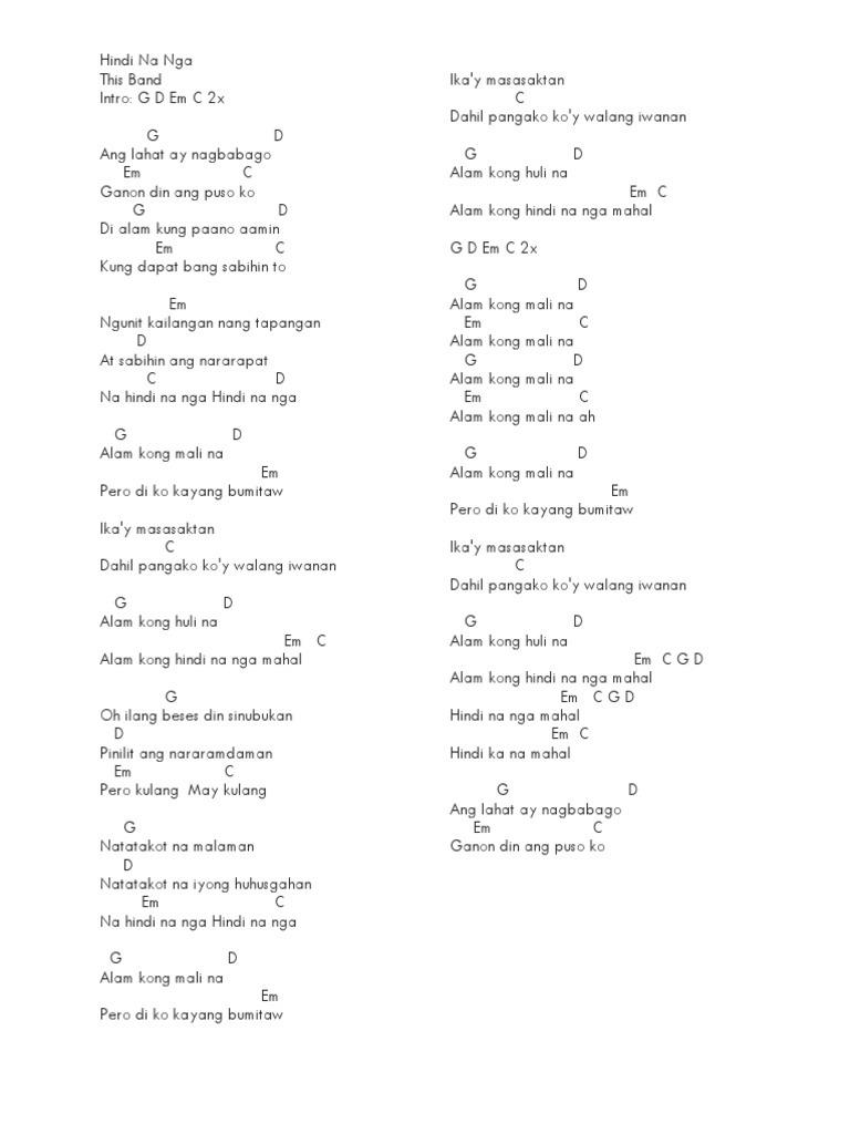 G D Em C x2 G D Ang lahat ay nagbabago Em C Ganon din ang puso ko G D Di alam. This Band - Hindi Na Nga chords To add strumming. Alam kong mali na Pero di ko kayang bumitaw Ikay masasaktan Dahil pangako koy walang iwanan.